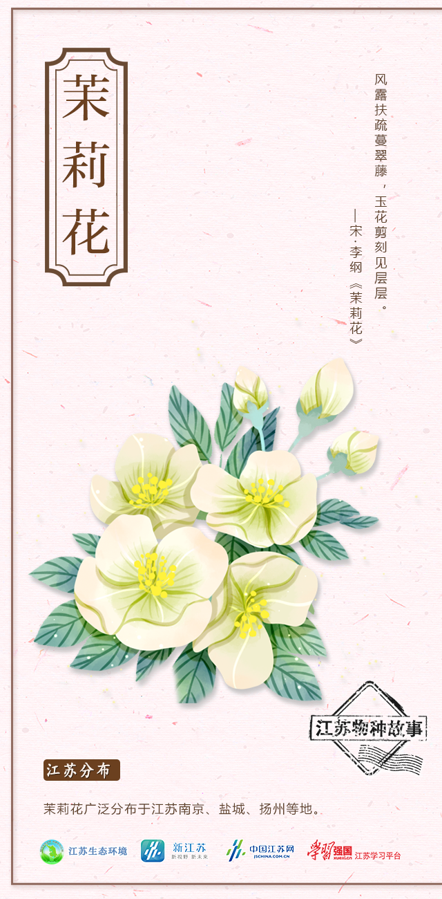 茉莉花廣泛分布于江蘇南京、鹽城、揚州等地。