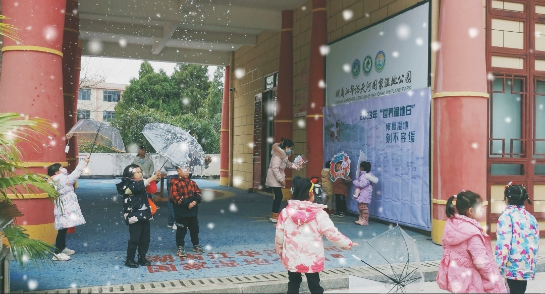 歡呼雀躍聲最大的要屬為大家精心打造的“世界濕地日”打卡點,小朋友們都撐著透明雨傘在漫天飄落的“雪花”中蹦蹦跳跳,你追我趕,開心極了。