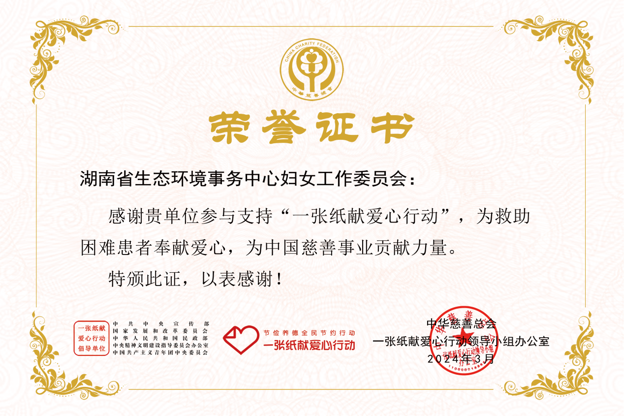 在3.8婦女節到來之際,以學雷鋒志愿服務月為契機,為進一步弘揚雷鋒精神,倡導“奉獻、友愛、互助、進步”的志愿精神,讓學雷鋒活動融入日常、化作經常,湖南省生態環境事務中心積極參加由中華慈善總會啟動的一張紙獻愛心行動公益活動,用身體力行踐行雷鋒精神。