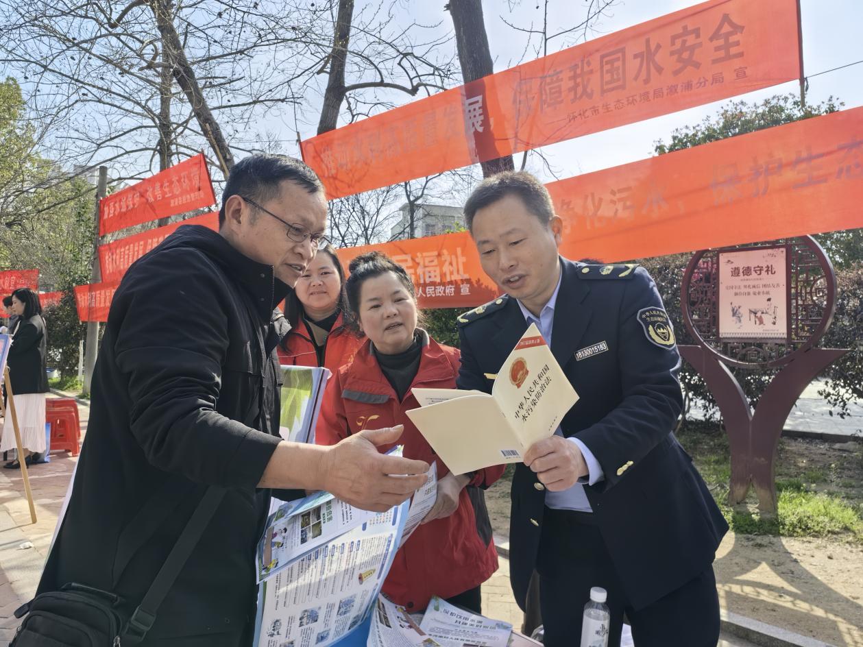 活動現場,溆浦志愿者協會(省綠色衛士溆浦大隊)協助溆浦分局、縣河長辦等各部門通過懸掛宣傳橫幅、擺放宣傳展板、發放宣傳手冊與資料,并結合現場講解等形式,向群眾宣傳《湖南省水污染防治條例》、《中華人民共和國長江保護法》內容,配合執法工作人員就相關防治措施和法律責任展開解讀,科普水資源保護、河湖生態環境恢復、節約用水等相關知識。工作人員結合案例講解水生態現狀,呼吁大家從身邊小事做起,共同參與水資源和水生態保護。