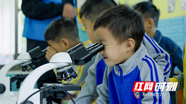▲孩子們用顯微鏡觀察微觀世界。
