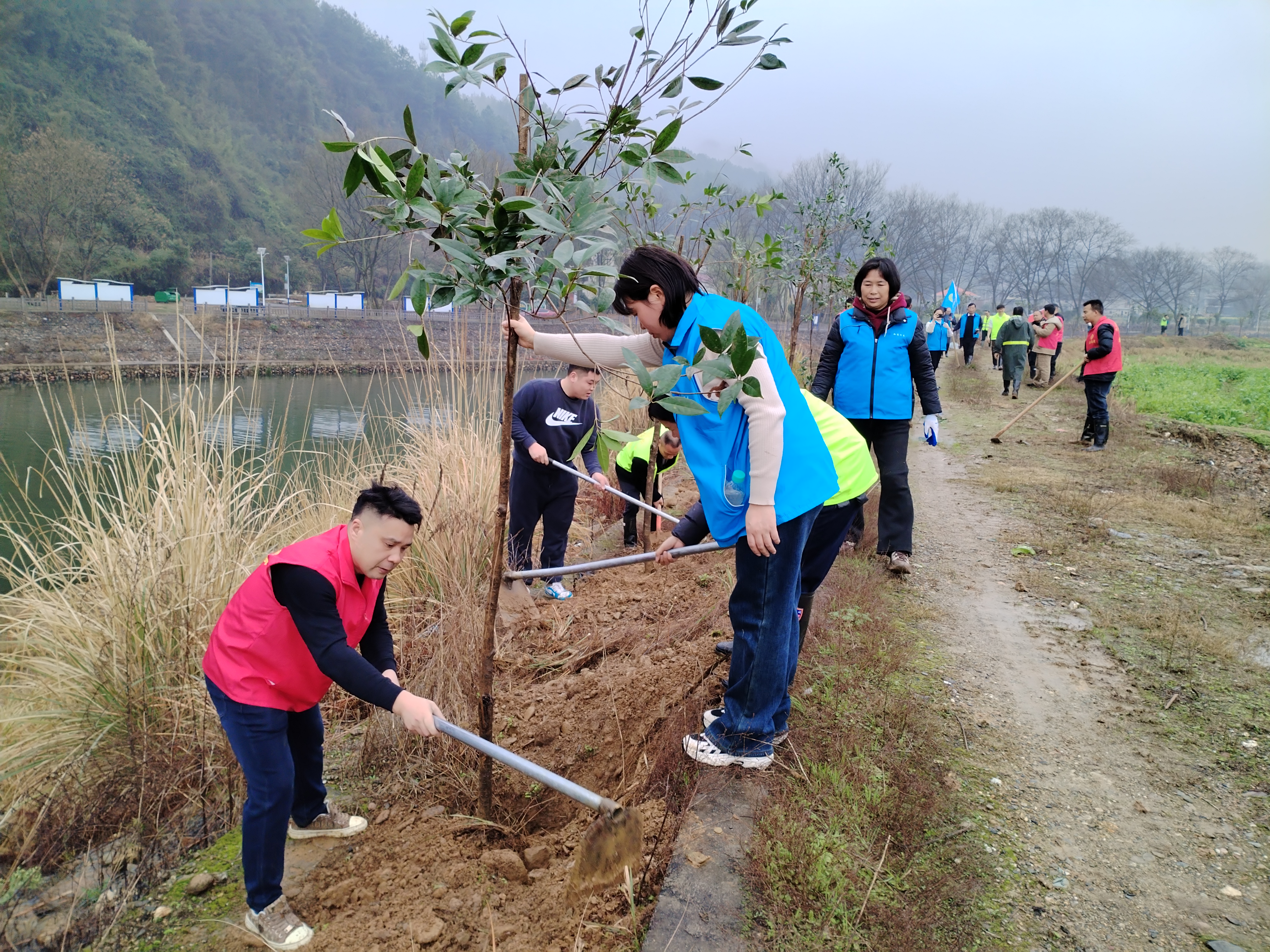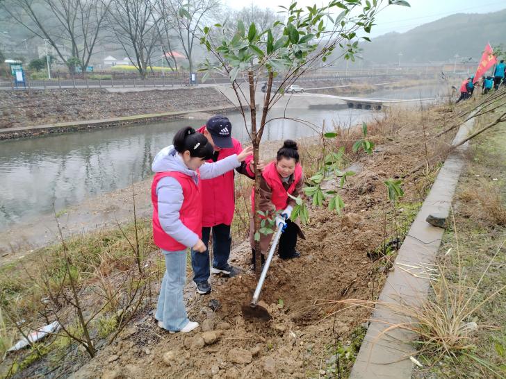 活動當日,工作人員與志愿者們熱情高漲,干勁十足。大家分工明確,有條不紊地開展植樹工作。有的志愿者扛起樹苗,步伐堅定地走向植樹區域;有的則揮動鋤頭,認真細致地挖坑;隨后,眾人齊心協力將樹苗扶正放入坑中,填土、壓實,每一個步驟都做得一絲不茍。在大家的共同努力下,一棵棵、一排排樹苗被成功栽種。經過數小時的辛勤勞作,共栽植樹苗達百棵。這些新栽下的樹苗在微風中輕輕搖曳,仿佛在向人們點頭致謝,也為溪口村增添了一片生機勃勃的綠色。