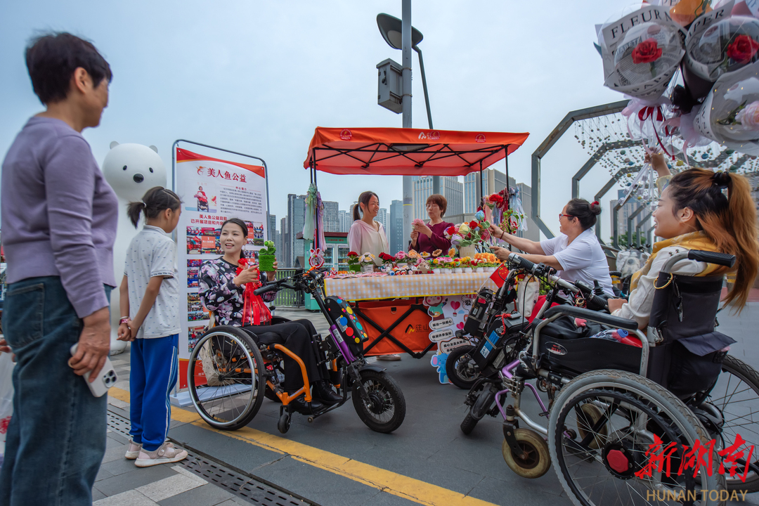 近期,美人魚公益開展手工助殘項目,售賣手工花、手工氣球、山水國畫等產品。圖為中國好人肖卓作帶殘友在擺攤銷售殘友們的作品。