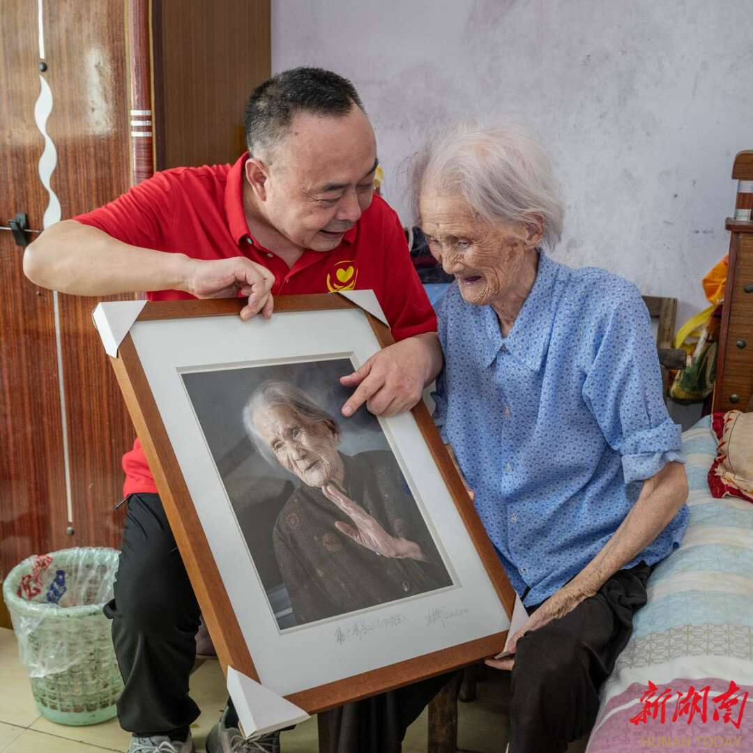 104歲的世紀老人楊奶奶,始終是華容縣愛在始終志愿者協會的重點關懷對象。今年,協會配合知名攝影師王琦平開展“為百名百歲左右老人留存時光印記”公益行動。畫面中,志愿者正將裝裱精美的照片送到楊奶奶手中,老人凝望照片里神采奕奕的自己,眼眸中漾起孩童般純粹的喜悅。