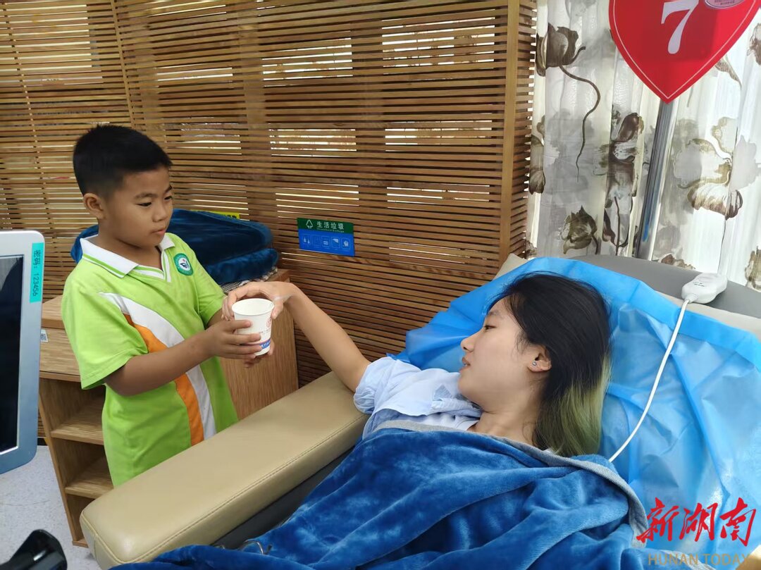 獻血從來不是一個人的孤軍奮戰,家人的陪伴像無聲的暖流,讓這份愛心在傳遞中多了份沉甸甸的溫度。圖中孩子遞來溫水的動作,是最質樸的鼓勵。