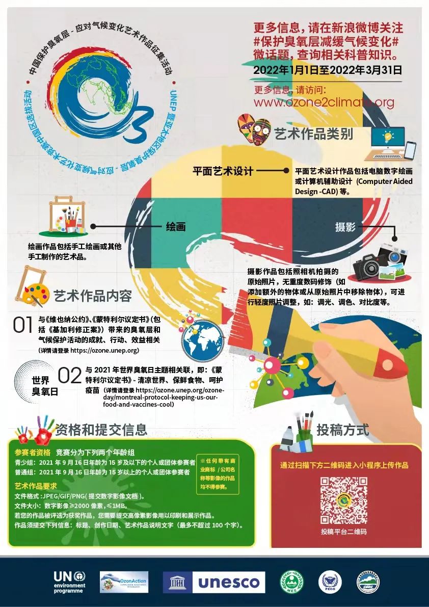 ?????相關(guān)背景信息和征集活動(dòng)信息,可從微信公眾號(hào)“微言環(huán)保”“中國(guó)環(huán)境宣傳教育”“生態(tài)環(huán)境部對(duì)外合作與交流中心”以及新浪微博#保護(hù)臭氧層應(yīng)對(duì)氣候變化# 微話題專(zhuān)題頁(yè)面獲取;也可以通過(guò)聯(lián)合國(guó)環(huán)境署臭氧秘書(shū)處官網(wǎng)(https://ozone.unep.org),或2021年世界臭氧日專(zhuān)題頁(yè)面(https://ozone.unep.org/ozone-day/montreal-protocol-keeping-us-our-food-and-vaccines-cool)查詢相關(guān)信息。