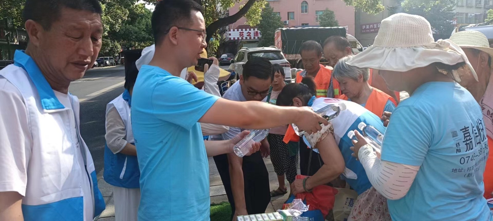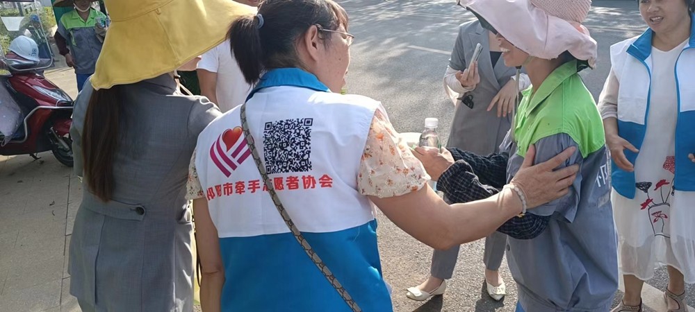 隨后,黨員們為一線交警、城管執法人員、環衛工人,送上礦泉水、綠豆沙、風油精、清涼油等防暑物資。