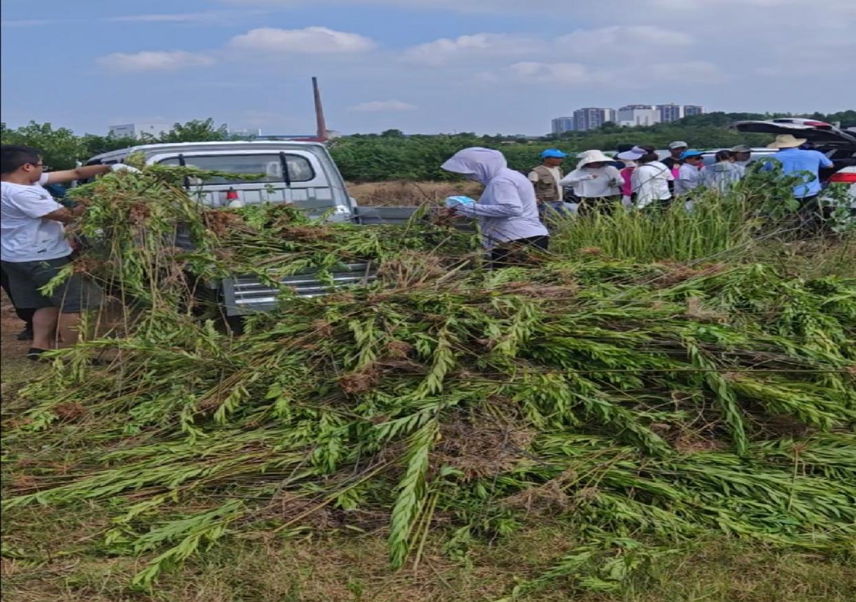 七月的株洲,暑氣漸盛,卻擋不住一群人為守護生態而行動的熱情。7月11日上午8:30至11:00,天元區群豐鎮貝貝草莓園里人頭攢動,天元區農業農村局牽頭,省綠色衛士株洲大隊承辦、天元區法院、區水利局、生態環境分局、城管局、檢察院、園林養護一所,以及工廠工會、河長助手服務隊、湖南航空技師學院航空系黨支部、群豐鎮及屬地社區等多家單位共同參與的“清除‘加拿大一枝黃花’,維護生態平衡”主題公益活動在此開展。七十余位參與者身著統一馬甲,化身“生態衛士”,用雙手為這片土地“減負”,完成六畝地的“加拿大一枝黃花”清除工作。