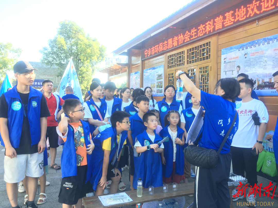 活動中,志愿者們舉起右手進行宣誓,隨后來到碧波蕩漾的溈江河畔開始巡河凈灘。經過一個多小時的凈灘結束后,孩子們轉場至生態科普中心前坪,圍聚在水質檢測儀旁,興趣盎然地觀察實驗過程。
