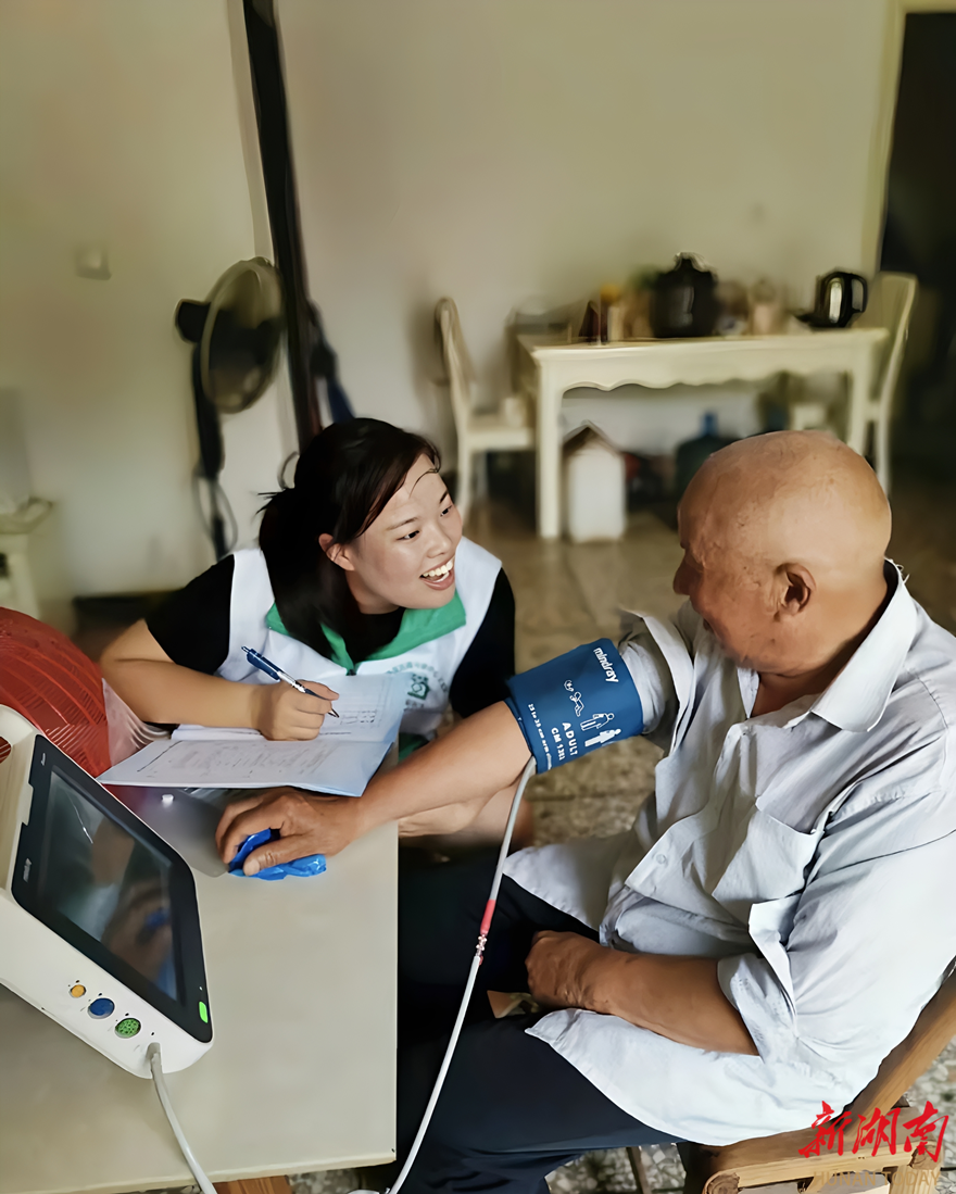 照片記錄了雨花區志愿服務聯合會的一名醫療志愿者走進鄉村,為行動不便的老人提供上門健康服務的溫馨場景。醫生耐心測量血壓、講解保健知識,老人專注傾聽,笑容樸實。畫面展現了基層醫療的溫情守護,傳遞了“健康入戶”的民生溫度,詮釋了醫者仁心的責任與擔當。