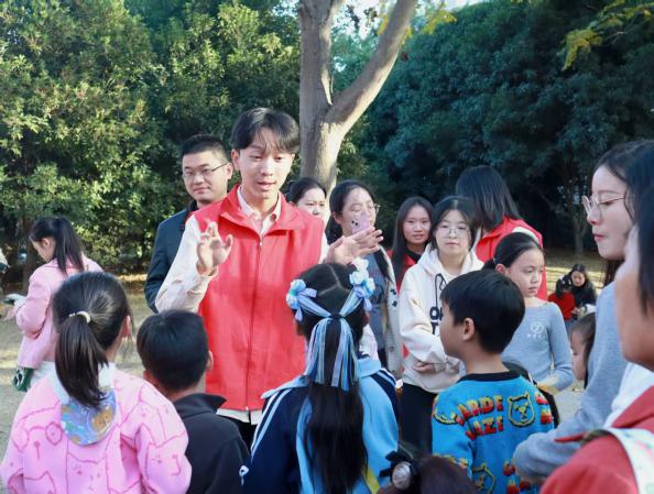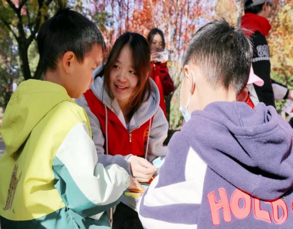 帶著這份“戰利品”,孩子們圍坐成圈,科普小課堂隨即開講。志愿者結合專業知識,細致講解了楓葉變色的科學原理,將復雜的植物學知識轉化為通俗易懂的語言。“平時在課堂上學的專業知識,能轉化為孩子聽得懂的科普內容,這種知識傳遞的過程特別有成就感。”志愿者朱國軍同學分享道。