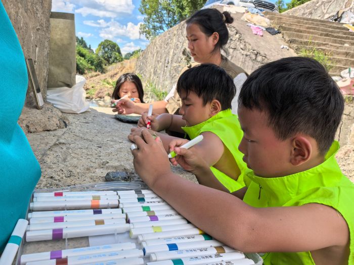清理結(jié)束后,河灘上的鵝卵石成了創(chuàng)作舞臺(tái)。小志愿者們提筆繪制:小魚吐著“別扔垃圾”的泡泡,稚嫩的筆跡寫著“保護(hù)小河”,一塊平整的大石上更是被鄭重涂上“綠水青山就是金山銀山”,綠色字體與岸邊草木、溪中清水相映,格外醒目。這些石頭從此“會(huì)說話”,默默傳遞著環(huán)保的力量。