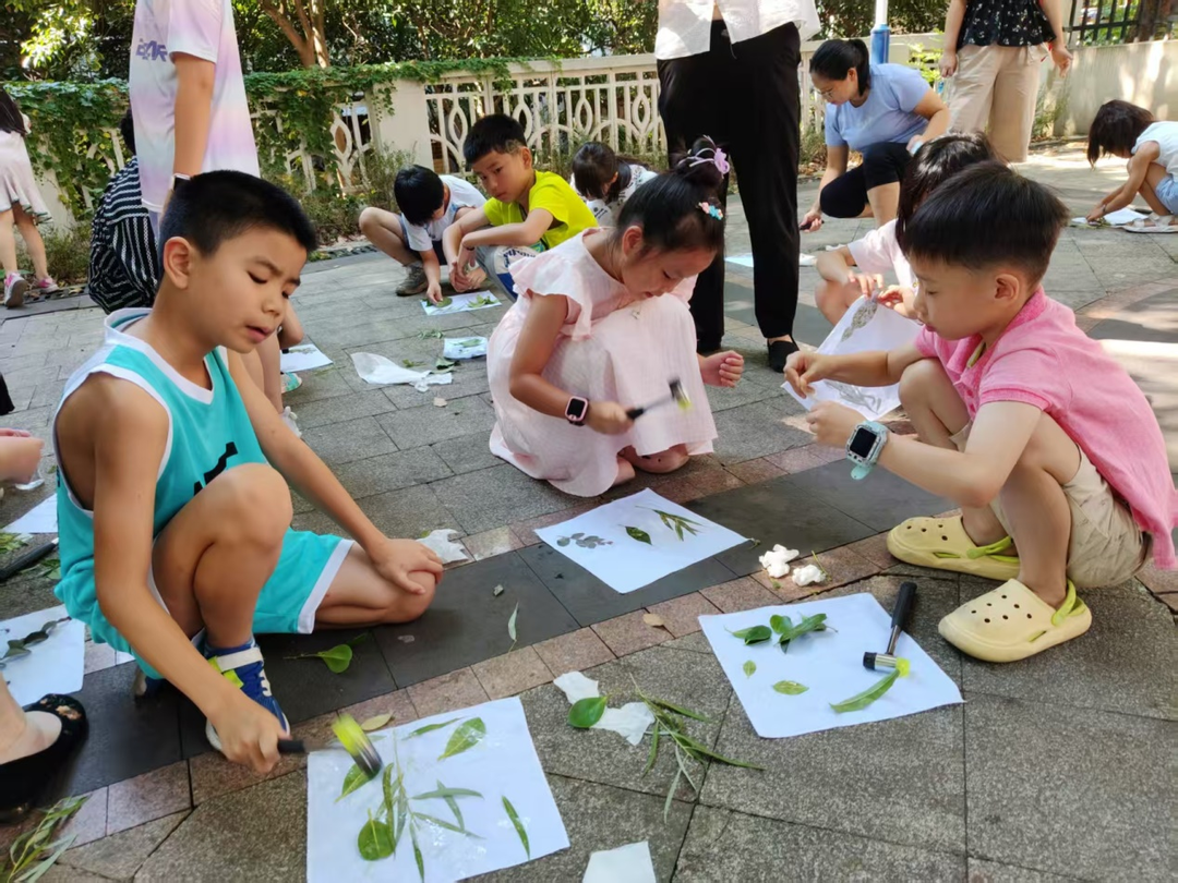隨后,趣味十足的拓印實踐環節拉開序幕。孩子們在志愿者的耐心指導下,先將收集的葉片、花朵用明礬水精心處理,制成專屬“創作原料”;再小心翼翼地用膠帶將植物固定在白色棉布上,手持小錘子輕輕敲擊。“咚咚咚”的敲擊聲此起彼伏,隨著力道的均勻傳遞,植物的清晰紋理與斑斕色彩逐漸在棉布上綻放,原本普通的布料瞬間變成獨一無二的自然藝術品,孩子們的臉上洋溢著滿滿的成就感。